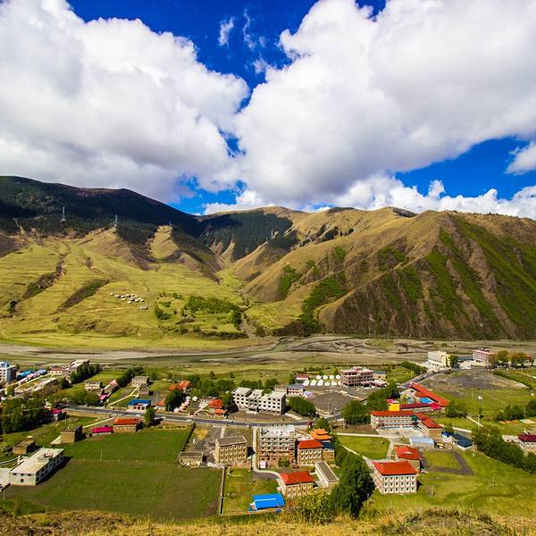 318国道穿过镇中心,由于车流量大,小车行驶缓...我们住的酒店离贡嘎雪山观景台很近。早上俩人步行十多分钟就到观景台脚下。由于天气不好,上去也看不到雪山。我们遂放弃登观景台,回到酒店直接驾车去雅江。