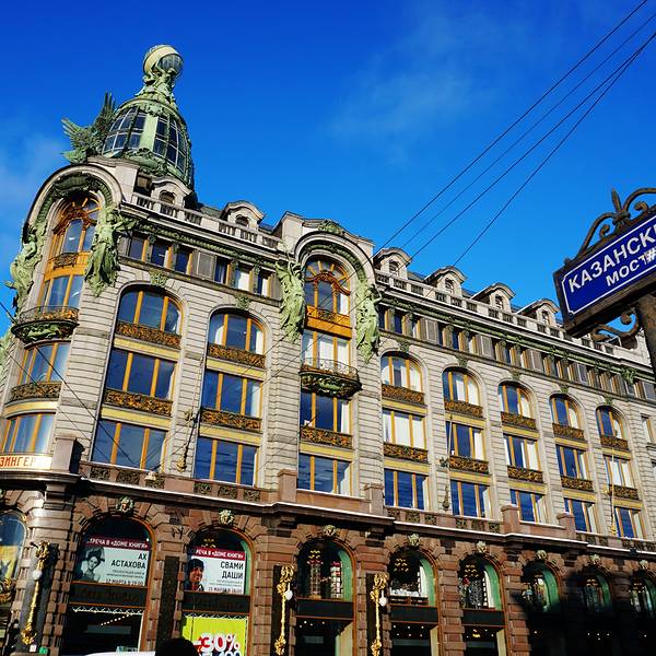 涅瓦大街上的“圣彼得堡图书大楼”,位于滴血大教堂和喀山大教堂正中,位置极佳。 这是一家非常有名的书店,其所在的大楼曾经是装订机公司的总部。这里的书籍比较齐全,但价格也要比其他书店高不少。二楼有一家咖啡吧,价格非常昂贵,不过这里有相当不错的风景,可以很好的欣赏熙熙攘攘的涅瓦大街和喀山大教堂的景色。