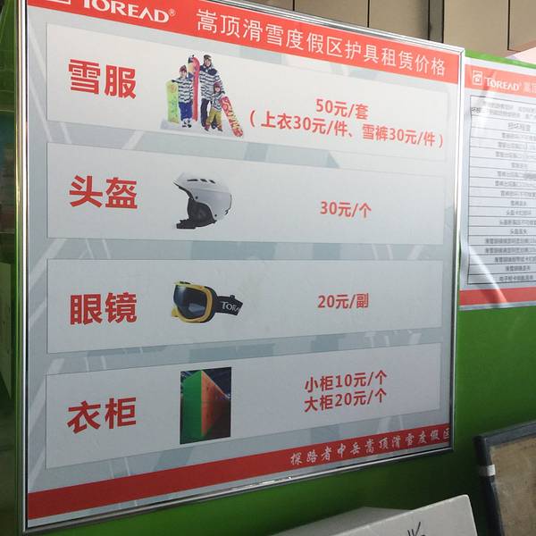 我和先生分别凭卡到窗口领取雪鞋、雪具。头盔、雪镜、柜子、头盔需要另租。