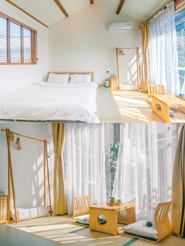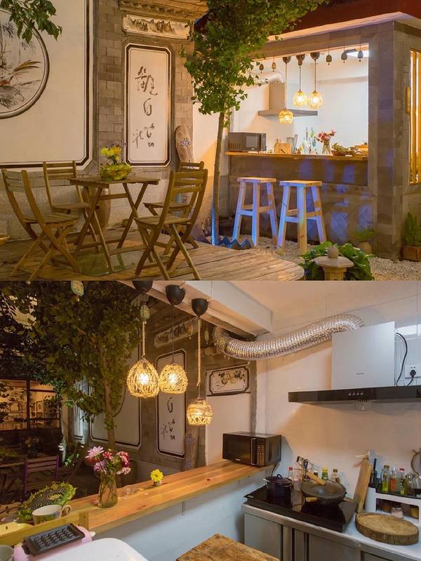 一推开门,就被庭院里的各种古风元素给吸引了;民宿还带有书吧和开放式厨房,零零散散的植物点缀得恰到好处,这种迎面而来的朴实之感让心灵在此刻得到安抚。