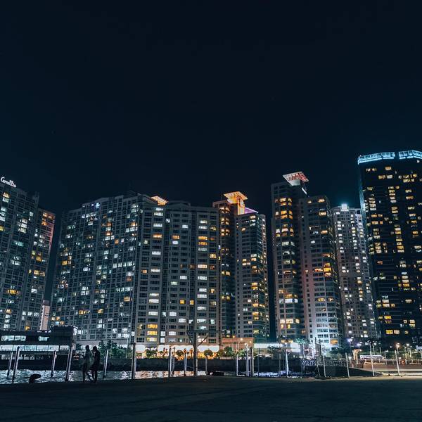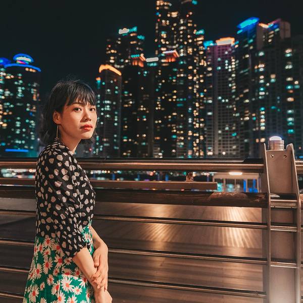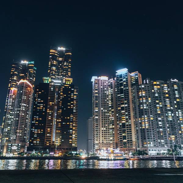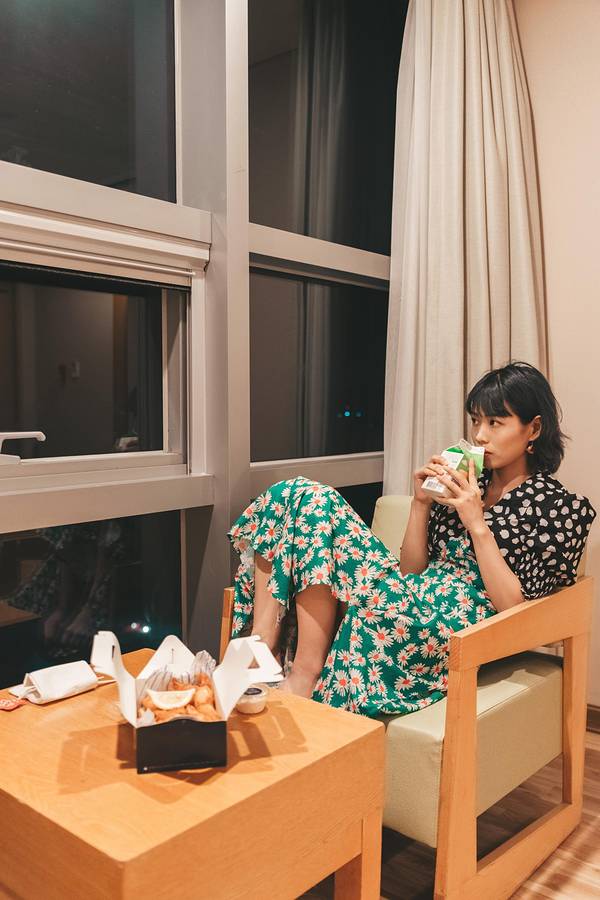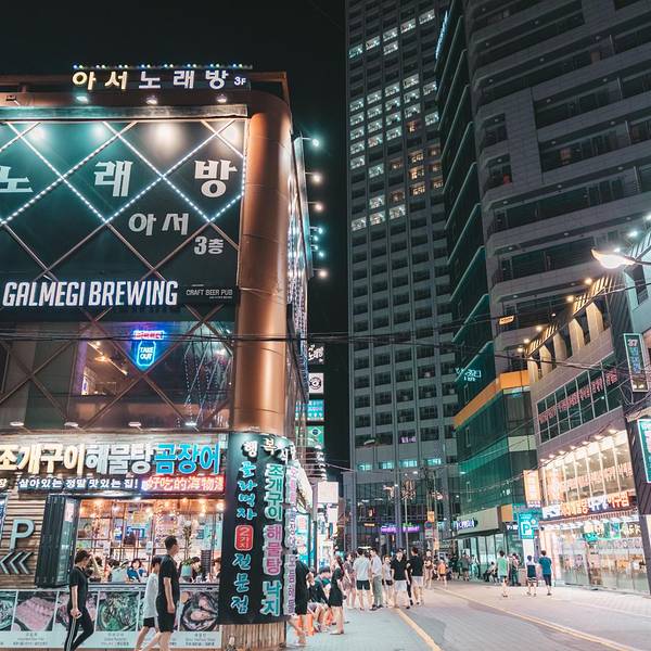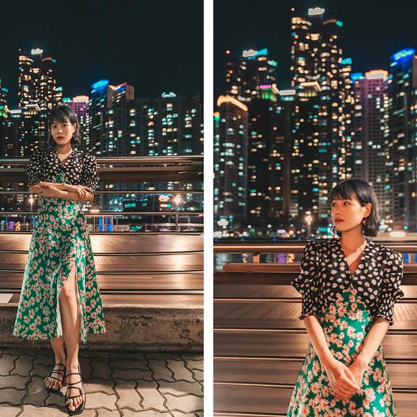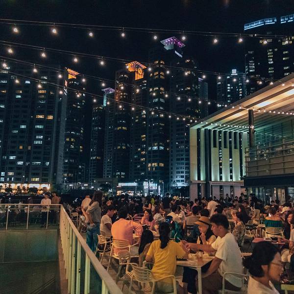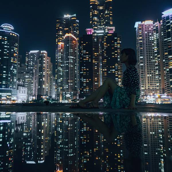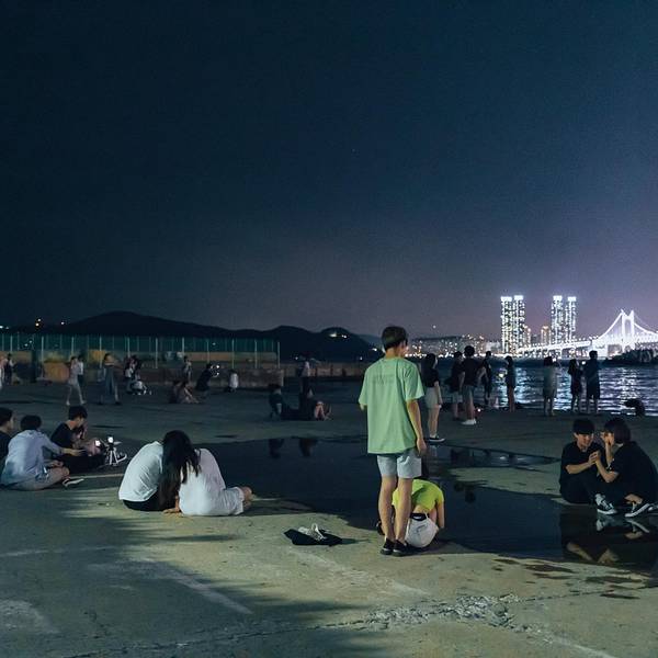 The Bay 101在海云台很出名,告诉司机他们一定知道。这里是一个集餐饮、购物和休闲娱乐为一体的高档中心,晚上这里像一个露天bar,很多釜山年轻人在这里吃东西,拍照。这里是我见过韩国情侣最多的地方。如果时间充裕,非常适合呆在这里融入当地人的夜生活。但是我们要来的是在它旁边的一个停车场,这里是拍海云台倒影的最佳机位。因为这个广场上有大滩的水,可以倒映出对面的建筑。不光是游客,连本地人也爱来这里拍照。我们在这里呆了一个小时,拍了几张非常酷炫的照片。但是这里最好用广角镜头,至少16mm,才能把大楼的全貌拍进去,我们是24mm镜头,大楼的顶就拍不到了。炸虾是在the bay 101买的,我们路过人群闻到香味被深深吸引了,这个炸虾特别嫩,虽然有点贵,要21000,但是很好吃。我们打包回酒店吃的。夜晚看着沙滩和大海,吃炸虾喝饮料,非常惬意。