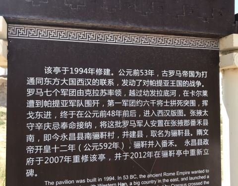 公元前53年,罗马东征安息(伊朗),结果惨败,长子普布利乌斯率第一军团突围,越安息东界,流徙西域。余部经多年辗转,归降西汉王朝,在今天永昌县的者来寨予以安置。汉称罗马为骊,故设骊县。