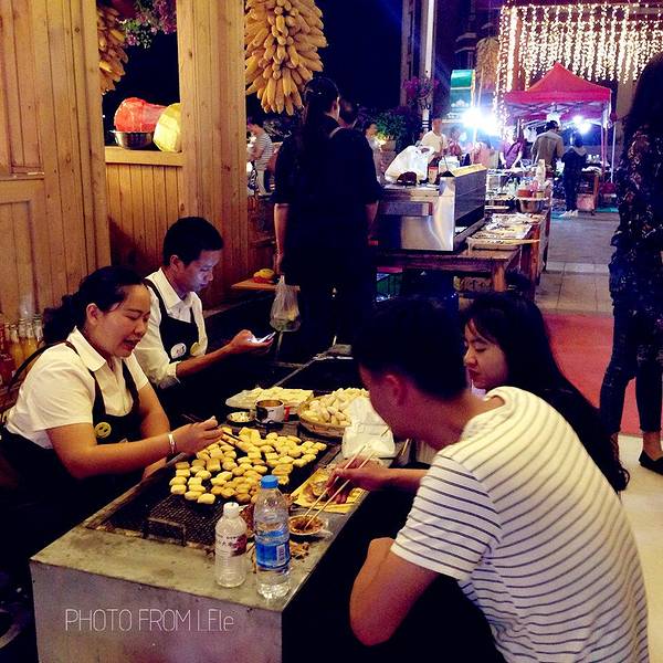 原本计划先随便吃点煎饼,然后再来紫陶看看有什么好吃的再吃点,结果一个煎饼就饱了,那就来逛逛散散步。 紫陶街不在古城,是在新城里面,距离大约3KM,我们选择打车过去,大概8元吧,有点记不得了。 之前来建水都没来过这里,是近两年才新建的,建水紫陶已经有上千年的历史,成为建水对外的一张亮丽名片,遗憾的是没有一个有规模、上档次的场所供游客选购紫陶产品。2015年第十一届中国红河·建水孔子文化节暨“建水紫陶文化旅游节”新闻发布会介绍,建水第一条紫陶文化主题商业街——建水紫陶街开始开放,这条街以紫陶销售及展示、休闲体验、度假观光为主的特色旅游步行街,弥补了建水没有紫陶作品展示街的空白。可爱的小鱼建水的周末果真热闹啊,才刚进入就人山人海,和古城形成鲜明对比,建水古城是白天热闹,到了夜晚街上的人都很少,静悄悄的。在这里一定要看好自己的包包手机,毕竟人多的地方不太安全。 夜晚的紫陶街卖什么的都有,有酒吧,有紫陶店,有卖烧烤的,卖果汁,卖衣服,卖鲜花,卖工艺品,手机贴膜的,应有尽有。完全看不出是卖高大上的紫陶的。烧豆腐~建水烧豆腐~最喜欢的拌芒果,想想就流口水各种鲜榨果汁,价格很便宜7-13元不等看花眼的坐垫鲜花也很多很多人在指路牌这里拍照,从上面走下来就是酒吧一条街,到了周末非常热闹果然是紫陶街啊,连喷泉都这么有特色。陶罐搭成的喷泉烧窑的砖房