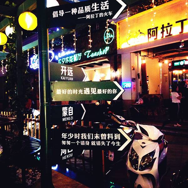 如果说有山有水有风景的建水还不能吸引你的话,那我现在要向你介绍的就是建水最出名的:建水紫陶。说起建水紫陶时间可能就要提到宋末年间了,制作工艺至今差不多拥有900年的历史了,也有这样的说法:有宋有青瓷,...如果说有山有水有风景的建水还不能吸引你的话,那我现在要向你介绍的就是建水最出名的:建水紫陶。说起建水紫陶时间可能就要提到宋末年间了,制作工艺至今差不多拥有900年的历史了,也有这样的说法:有宋有青瓷,元有青花,明有粗瓷,清有紫陶。在这里你可以从紫陶的生产,再到销售,再到展示,整个紫陶的一条路的产出都可以了解到。而且在特色的商业步行街内你可以品尝到正宗的建水小吃。每天傍晚时刻,在这里就会有各种地道的当地及周边特色小吃,蒸的,炸的,煮的在这里都可以满足你挑剔的味蕾。而且你也能感受到建水人的热情与淳朴。在这里,你会发现这里每一家紫陶店都有着不同的风格与调调,而且店铺的老板非常的热情,虽然没有购买,但是她依然认真热忱的给我们介绍特色的紫陶物件。建水紫陶是云南省建水县的汉族传统手工艺品,始于元末明初。看到如此可爱的卡通造型的紫陶,同行的小伙伴早已被萌化了心。据资料上说,用建水近郊五色陶土(红黄青褐白)制作成型,经过书画、雕刻、填刮、烧炼、磨光等工序,陶器色泽深紫,花纹雪白,叩声如磐。其中胎色若羊肝者,尤为上品。建水的紫陶可以说的上是种类繁多,有茶具,花盆,器具及饰品。每种不同的紫陶制作的手续也是不同,而且听说用紫陶做出来的蒸具,不管是蒸米饭还是蒸肉,口味绝对上佳。其实紫陶作为装饰品也是非常不错的,不过也是由于此次出行携带的东西太多,要不真还想购买一些小玩意回到家里摆放装饰起来。紫陶街夜晚非常的漂亮,头顶是色彩斑斓的灯笼,脚下是潺潺的流水,街道放着悠扬的轻音乐,走在这里真的让人仿佛行走在古镇一般舒心。差不多也到了饭点的时候了,今天晚上我们选择了在建水口碑也非常不错的饭店:临安故事。这里不但可以吃到正宗的建水美食,也是一家客栈,对于出行的游人来说还是非常方便的,而且它距离朱家花园等景区只有几分钟的路程,很近。这家的饭菜量还是比较足的,从口味上来说对于我这个北方人还是能吃的习惯,本来云南菜还是比较偏重一些的。