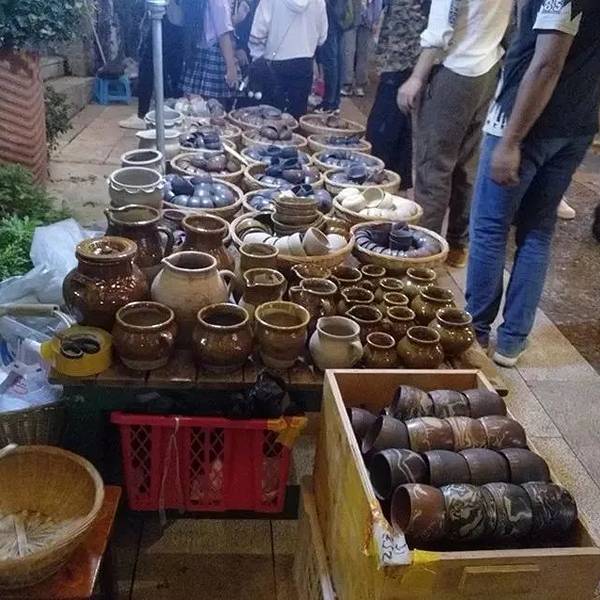 吃晚了晚餐,不妨顺着广慈湖走一走,五分钟就到了紫陶街,感受一下这里的夜市。紫陶街应该是来建水必打卡景点之一吧。这条街不长,如果单走,三分钟就走完了。但就是两旁的紫陶店,还有沿街摆起的摊子,让你迈不开步伐,并且,满街的紫陶杯子、茶具等,总能找到几样你喜欢的小东小西。倘若不赶时间,还能走进店里,感受一下自己做陶的乐趣。亲手做陶一般是按照时间收费的,如果你的作品完整的话,老板会按照你预留的地址寄给你的,当然,邮费你要自己出。晚上的紫陶街和白天是完全不一样的。晚上在这里就是逛、吃,逛、吃,全国的夜市小吃街基本上都是一样的,从鲜榨的果汁,到义乌的小商品,这就是逛夜市的标准姿势了,涌动的人头,驻足观看的游客,就是那么热闹。不过,可以买上几件自己喜欢的陶艺品,或是杯子,或是壶。把拍照的时间,留给第二天的白天吧。