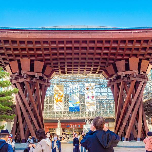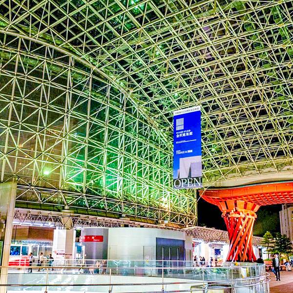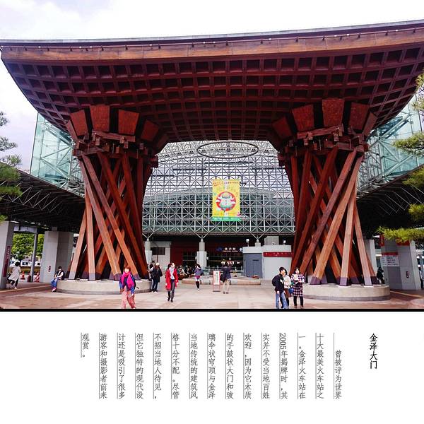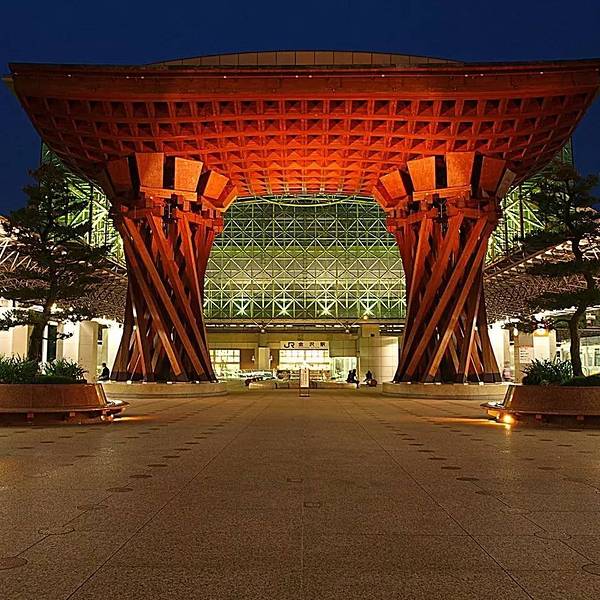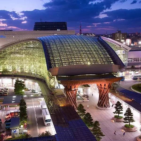 金泽火车站位于日本石川县金泽市北安江町,是西日本旅客铁道(JR西日本)的铁路车站,兴建中的北陆新干线将会延伸到这里。金泽火车是日本石川县最大的火车站,车站很特別,是一座玻璃配合木材的建筑,结合新式及传统日式的风格,洋溢着浓厚的新世纪设计风格。在进入火车站之前,首先映入眼帘的是一个高14米的褐红色大门,雄伟壮观。这座巨大的不绣钢网格结构建筑闪烁着金属的光泽,大门的圆屋顶上有3000块玻璃窗格连接了东西,带领顾客进入车站。就算在车站内等车,也不会感到无聊,因为在金泽火车站内部有耍杂技的,乘客可以坐在旁边观赏。