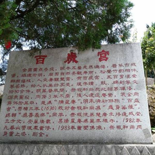 据说无暇和尚24岁剃度为和尚,26岁是时来到九华山扎茅修行,修行了100年,在126岁时圆寂,...九华山百岁宫位于九华山插霄峰顶,可以坐缆车上去,往返100元,单程55元。百岁宫供奉着无暇和尚的肉身,据说无暇和尚24岁剃度为和尚,26岁是时来到九华山扎茅修行,修行了100年,在126岁时圆寂,其肉身三年不见腐...九华山百岁宫位于九华山插霄峰顶,可以坐缆车上去,往返100元,单程55元。百岁宫供奉着无暇和尚的肉身,据说无暇和尚24岁剃度为和尚,26岁是时来到九华山扎茅修行,修行了100年,在126岁时圆寂,其肉身三年不见腐烂,现其肉身已经贴金,供奉在百岁宫,被称为“感应化菩萨”。到九华山的游客没有不游百岁宫的。 展开