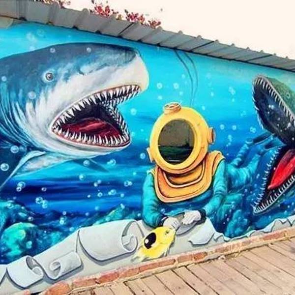 你以为自己身处大海,不过是躺在好美里彩绘村的地板上 哗!张开血盆大口,海底霸者的鲨鱼冲破围墙,朝着路上的你“疯狂”袭来,全台湾首创的立体绘画便在好美里彩绘村,刺激的海底世界正欢迎我们去探索。