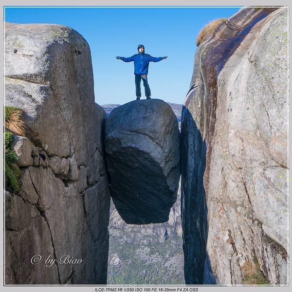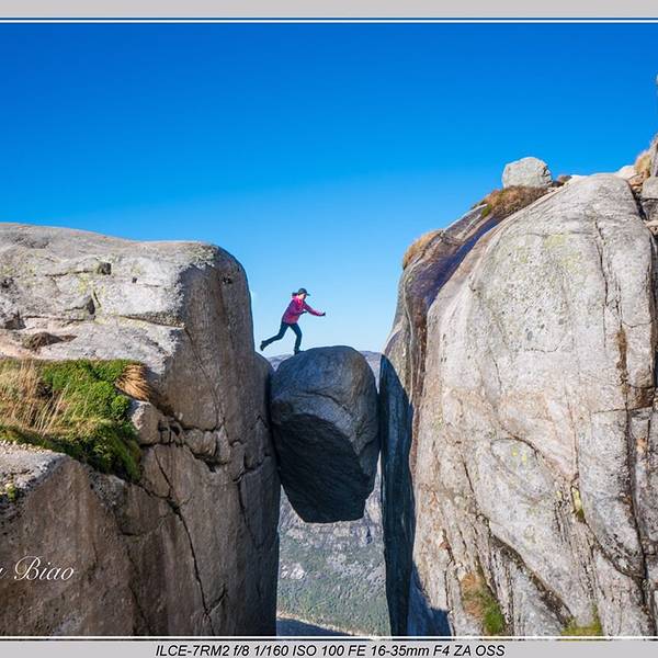 奇迹石又名谢拉格伯顿石,是悬空于峡湾之上约1000米、夹在两块巨岩裂缝中的一块直径约2米的石头。