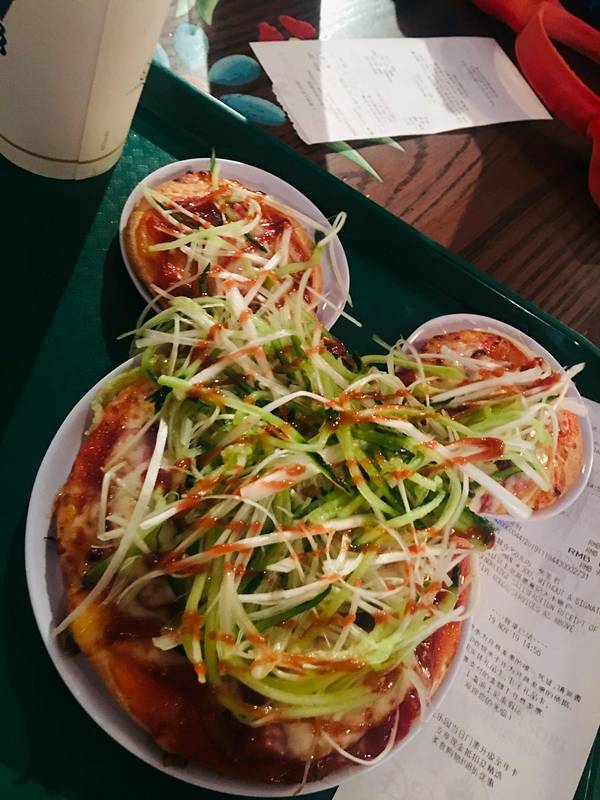 皮诺丘乡村厨房的北京烤鸭米奇头披萨奏似它啦!北京烤鸭风味米奇披萨。薄底披萨,其实不大,1个人食量大的话也不一定管饱。 好像是78一份?有点忘记了。 觉得是这家最好吃的东西了。 可以选择套餐+十几块钱,+一杯饮料猪骨屯拉面,淡而无味,自己带点盐吧 一碗面应该是68块吧。千层面(大概也是68块):味道十分奇异,还是别试了。