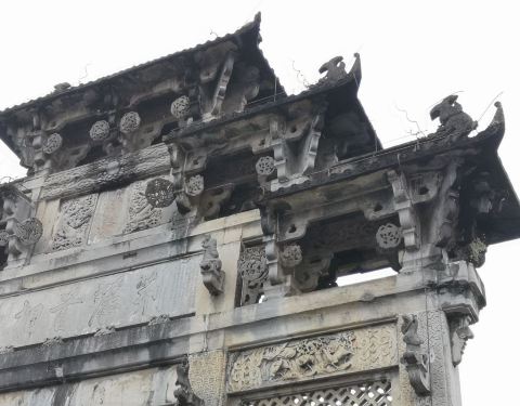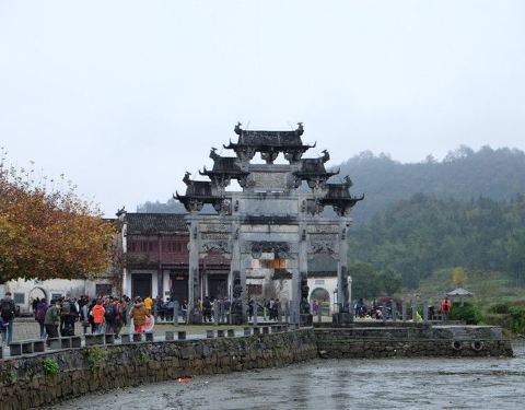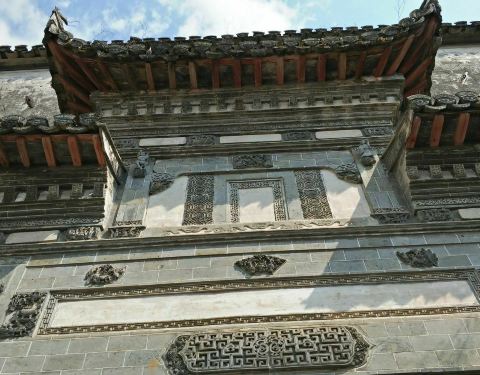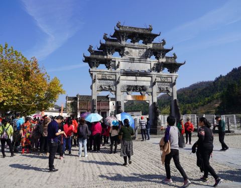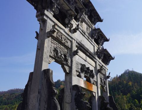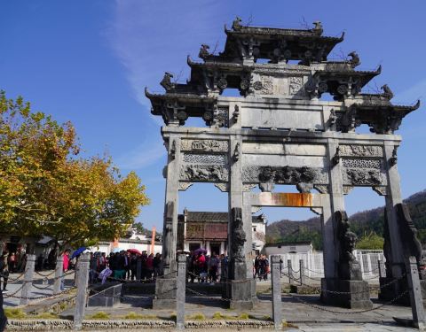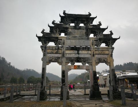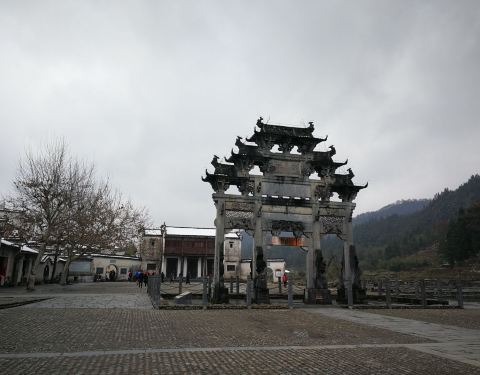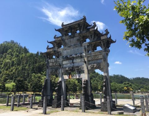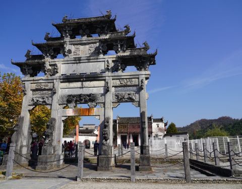 胡文光牌坊,建于明万历六年(公元1578年),气势恢弘,代表着胡氏家族的显赫地位。牌坊通体采用当地的“黟县青”大理石雕筑而成,顶上有五层,每一层都有不同的精美石雕。牌楼边是明经湖,可以拍摄徽派建筑的倒影。