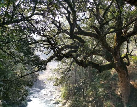 凭栏望,古树虬枝风采犹在,潺潺的溪水在石缝间跳跃,山谷生气勃勃,丝毫没有秋的萧瑟
