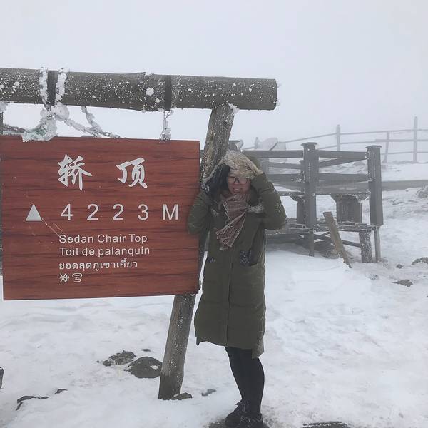 越往上雪越大终于到轿顶,风太大了,温度好低,实在冻到收不拿不出来,赶紧拍了两张照片,下山。我和同行小伙伴到顶,没有其他人估计都是拍拍照片赶紧下山。看我的帽子,靓丽的风景线指示牌都被雪覆盖了,看不到