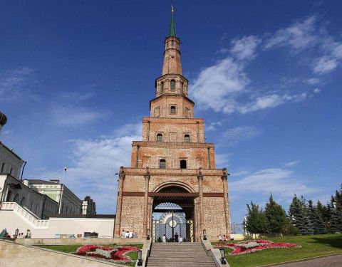 苏尤姆别卡塔楼,在喀山的克林姆林宫内,这座建筑建造的非常匆忙,地基只有1.4米,资料介绍这座塔楼已经向东北方向倾斜2米了,如同中国的苏州的虎丘塔,以及意大利的比萨斜塔。