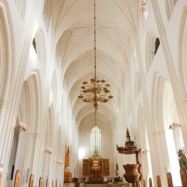 Sankt Knuds教堂始建于14世纪,是典型的哥特式建筑风格,具有悠久的历史,人们也习惯称它为欧登塞大教堂。Sankt Knuds教堂以丹麦国王的神圣称号来命名,Knud 国王1086年在圣阿班教堂遇刺后也埋葬于此。教堂的值得参观的部分就是展示有Knud国王及其兄弟遗体的地下室。整个教堂是红墙白壁,内设一个可可式讲道坛以及16世纪的圣坛雕刻,有着300多个雕塑作品,具有重要的历史价值。