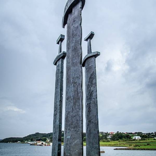 岩中之剑是斯塔万格为了纪念“Hafrsfjord之战”而建立的雕塑,雕塑由三把十几米高的维京巨剑组成,分表代表和平、统一和自由。剑中熔入了从全国各地发现的古剑,可谓“铸剑为剑”。在传说中,挪威的统一甚至发端于一个浪漫故事:Hordaland国王的女儿Gyda拒绝Harald的求婚时说,除非他能成为“整个挪威的国王”。Harald发誓在他做到这件事之前不再修剪或梳理自己的头发,从此“金发哈拉尔德”的威名令敌人闻风丧胆。Hordaland国王作为Harald统一挪威的最后对手,和几个儿子一起战死于“Hafrsfjord之战”。Gyda不得不嫁给杀死父亲和兄弟的仇人,成为他的第九个妻子,后来在丈夫迎娶更高贵的丹麦公主时被抛弃。1983年,国王Olav在这里为雕塑家Fritz Røed设计的“Sverd i fjell”揭幕。