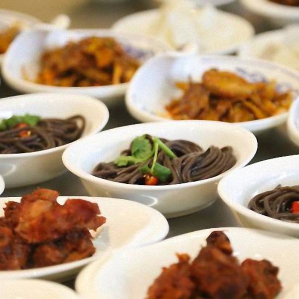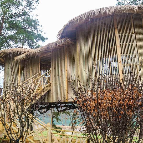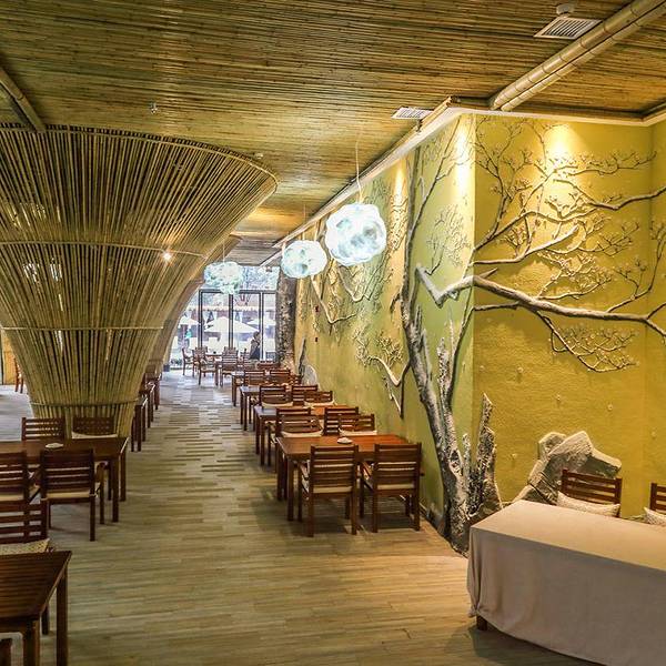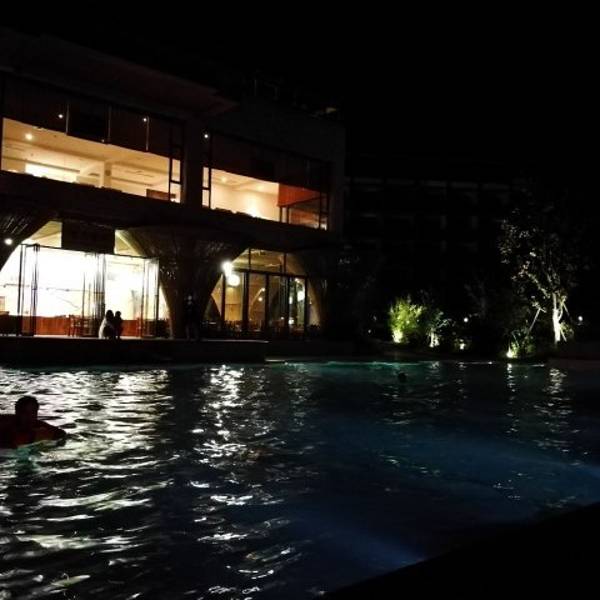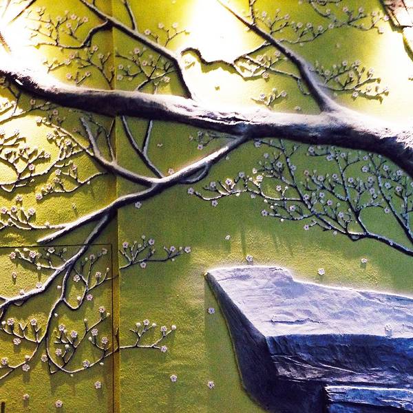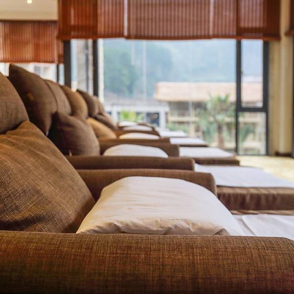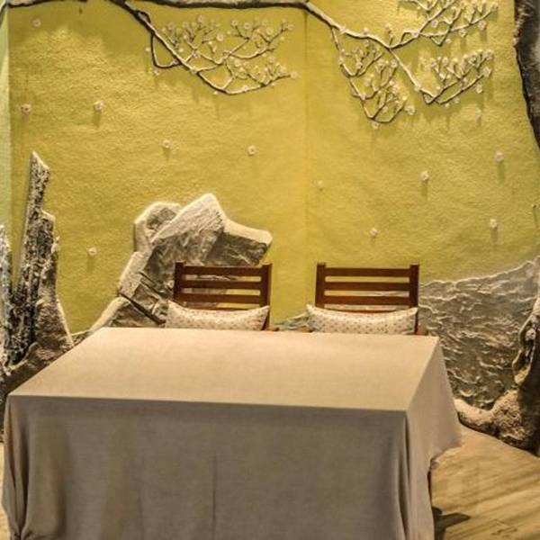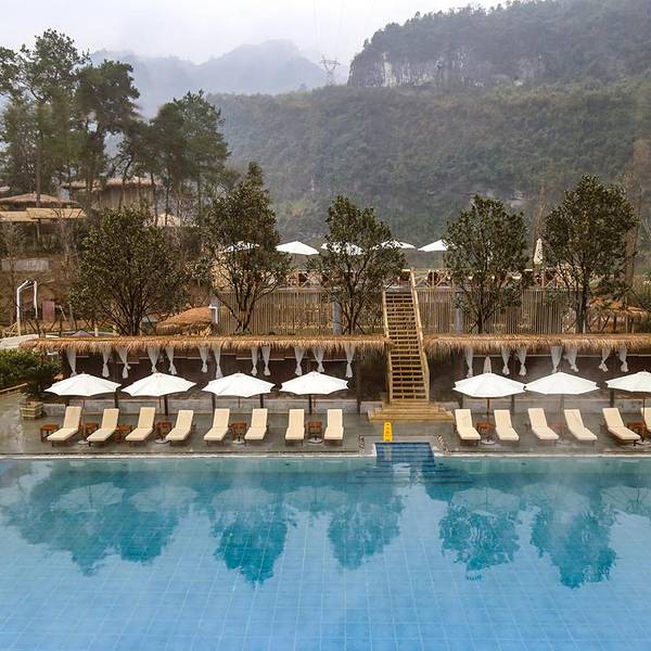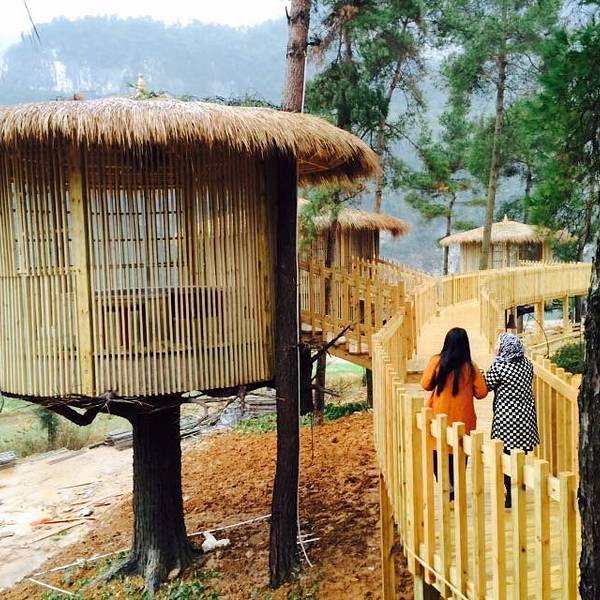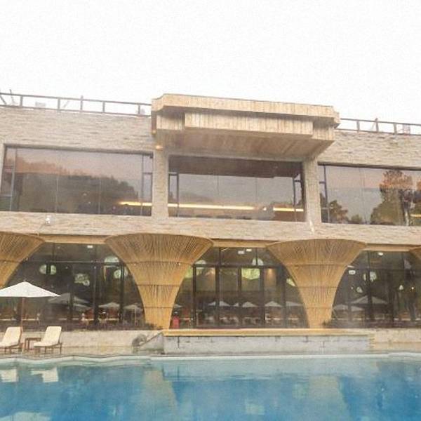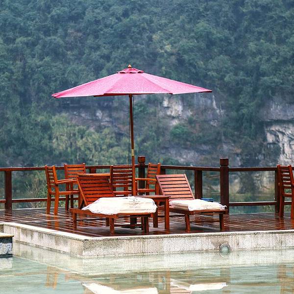 温泉中的桃源,热气腾腾的活水,奇趣的泡池树屋。 爬完半山看溶洞之后,下来泡个温泉也是极好的。九龙洞温泉度假庄园一共分为三层,大门进去之后是最高层的露天晚宴厅,不仅能够把远处葱茏的山脉尽收眼底,走到边边还能俯瞰整个温泉区的风貌。往下走就是二层,这里有一个沐足大厅,落地玻璃直接看到下面的游泳池,视野太赞了。最底下的一层是九龙洞温泉的「梨花又一村」。我好喜欢这个餐厅哦,墙壁全都覆上一树一树绽放的梨花浮雕,另一边全是透明落地玻璃,天花还垂下来一盏一盏软乎乎的棉花吊灯,整体文艺又清新,在这里吃饭也吃得特别香了。单看墙壁真的跟一幅画一样,像这样的浮雕墙我曾经在大学景观设计课上为母校小梅园的一处荒废长墙做过,心里想的成品大概是这个样子,现在看着实物挺感慨的。小菜都准备得好精致,还有我最喜欢吃的冷荞麦面!从餐厅出来就是温泉泡池区,靠近看游泳池池面上还有腾腾升起的蒸汽,探手下去,水质润滑,非常热乎,很想一头扎进去了。经理介绍说九龙洞温泉的泉眼在地底下1810米处,探出水后直接把活水引到泳池里来,温泉水不断循环,完全纯天然无污染。可惜我们来工作的,不能下水呜呜呜,只能绕着泳池走。从对面回头看餐厅和度假村建筑,风格还蛮有日式的感觉,让我想起青山周平小天使的设计了。最有趣的还是这些树屋温泉啦,很有私密性,完全可以开温泉趴体,打牌都可以走起啊!