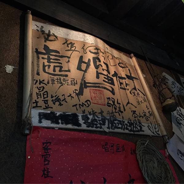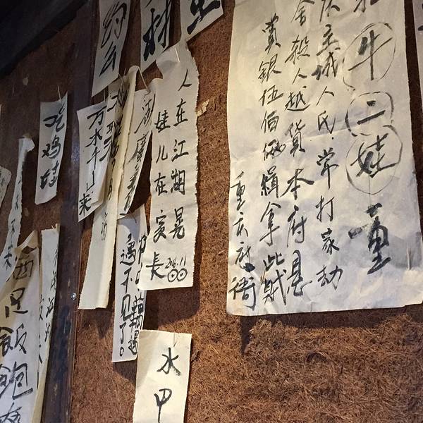 从长江索道步行到湖广会馆,刚好看到会馆边上有一家江湖菜。 所在的建筑外部在装修,找了一会儿才找到入口,里面装修风格特别武侠风,好像古装电视剧里的小酒馆,提供笔墨让客人自己写字贴上墙。 点了两菜一饭,都特别惊艳,家常味道,又让人停不下筷子。