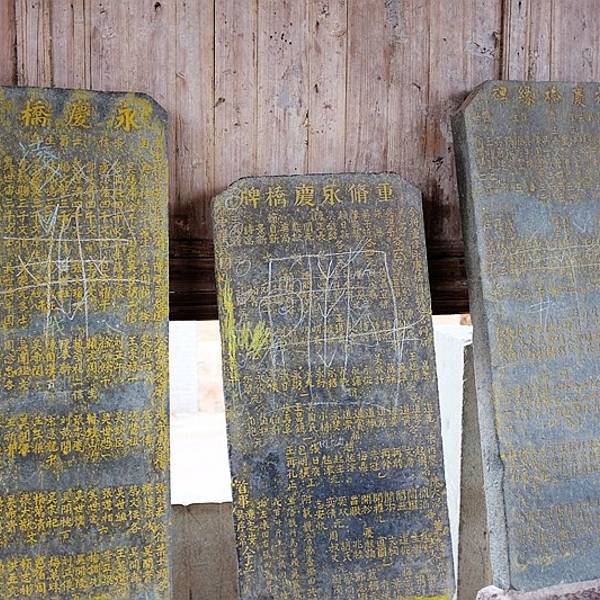 傍晚赶到了永庆桥头。这是一座几乎是荒废在村头的老桥。这座桥的结构与文重桥有些类似,只是比文重桥长一些,桥下中间一个巨大的青石叠砌成的桥墩,桥面的条木就通过桥墩横铺在河的两岸。