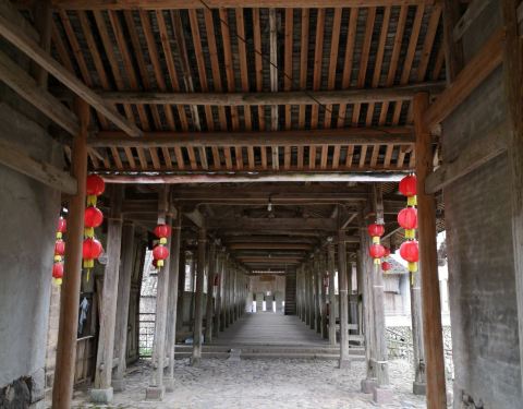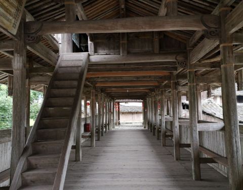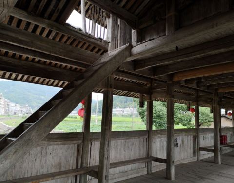 永庆桥的一头靠着村里的公路,一头隐藏在村庄里的老屋群中,外观很不醒目,给人的感觉,就好像是——“路转溪头忽现”。桥身中端有阁楼,有木梯可以上下,我好奇的上去看了,目前是堆放了不少修桥材料,因为还有...