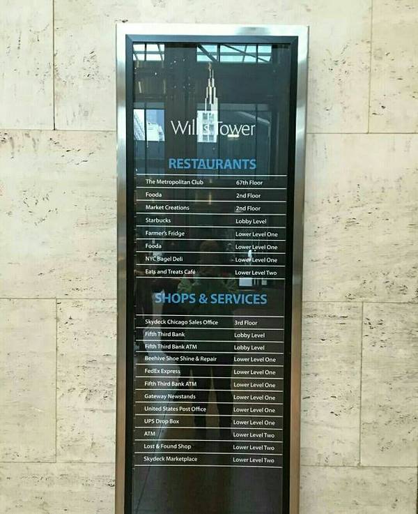 Tower一楼有一个很大的周边店,里边有很多芝加哥的周边,要买纪念品可以在那边买芝加哥第一高楼,从空中俯视威利斯大厦,像是一个高低不一的九宫格,威利斯大厦上有全透明玻璃窗格,Willis Tower一楼有一个很大的周边店,里边有很多芝加哥的周边,要买纪念品可以在那边买。