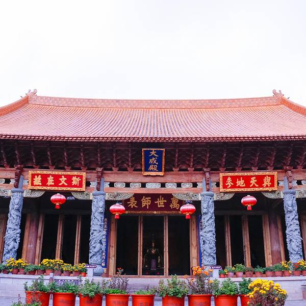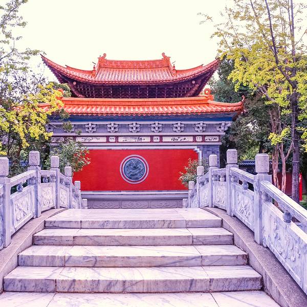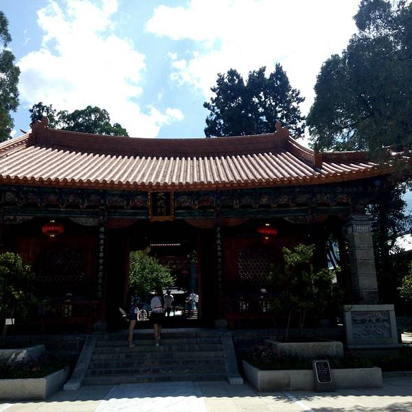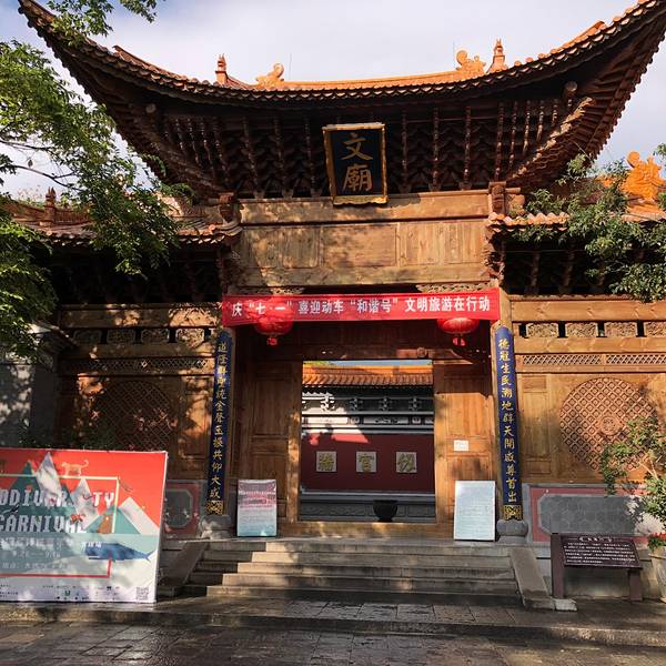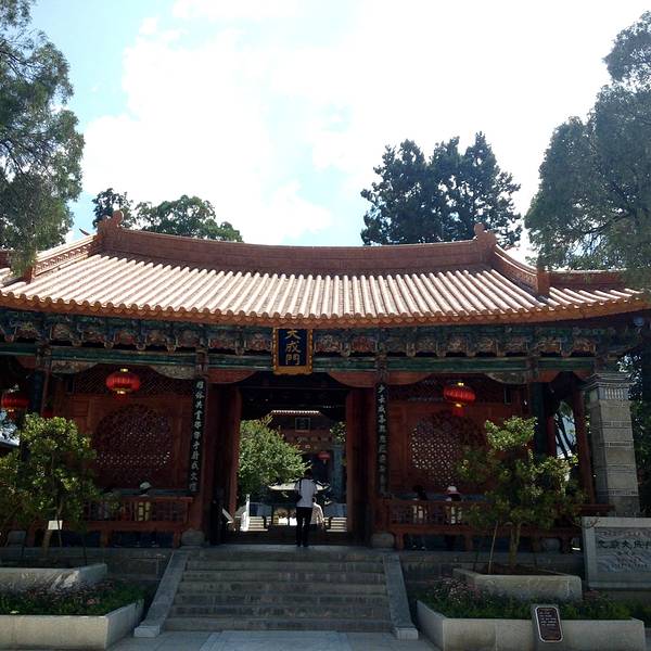 大理文庙位于大理古城西南,始建于明洪武年间,为州学,州升府后称府学,又称庙学、学宫。文庙主要建筑完成于明洪武年间,后经天顺、成化、弘治、嘉靖多年修葺,扩建,形成了规模宏伟的古建筑群。整个文庙占地10000余平方米,共有大小十三个院落。大成门后古建筑保存完好。2003年被大理州人民政府公布为文物保护单位。文庙中轴线为南北向,自南为照壁,前为泮池,上有石拱桥,池四周以石围栏,前为一高两低三跨式石牌坊,曰棂星门,石坊左侧有门曰礼门,右侧曰义路,坊后右侧为名宦祠、兴贤祠,左为乡贤祠、承祭祠,中为甬道至大成门,门上挂一大匾书“大成”二字,院中四角植柏树,大成门后中为甬道,两侧为东西两厢,院以方砖铺砌,四角植柏树,甬道直达大成殿拜台,俗称天子台,台高约1米,三周环以汉白玉石栏,后为大成殿,殿为单檐歇山顶,面阔七间,进深15.6米,高11米,规模宏伟,庄严大方,内供孔子牌位,中间的两棵立柱上雕刻两条盘龙。大成殿后为雁塔坊,重檐歇山顶牌楼式建筑,檐下四面设斗拱,八个翼角飞展,中间以圆门贯通,后为崇圣祠,祠后为尊经阁,阁内祀仓圣,曾藏古籍千余册。崇圣祠左为明伦堂,堂内有八扇格子门,镂空雕刻是艺术精品,工艺价值最高。堂下设射圃,旁立一小巧石坊,原书“佳径”(嘉晋谐音),1982年改为“柏苑”。