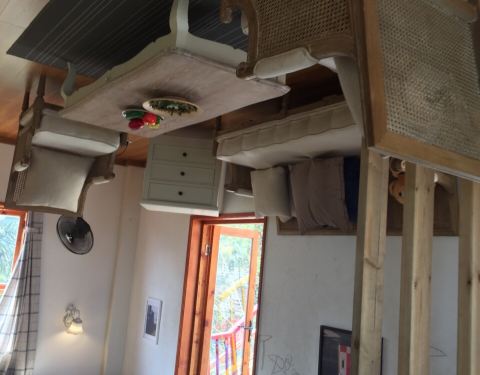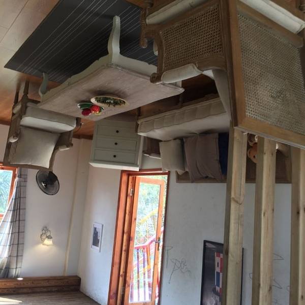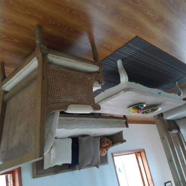 青山绿水的岩头古村口坐落着这样一幢奇异的倒置屋,远远望去就让人觉得新奇,门票25元也算亲民,走进屋里顿时有种失重般的晕眩感,所有的家具和家私全都倒置过来,感觉实在是太奇妙了,一楼是客厅厨房和卫生室,二楼是卧室和书房,完全是按照正常的房间来摆设的,只是地板有一定的倾斜于是加重了晕眩感,有高血压的人慎往!