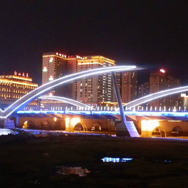 大桥造型非常新颖,横跨延吉市的母亲河布尔哈通河,尤其是夜景非常的漂亮,夜晚散步或驻足布尔哈通河,欣赏大桥,别有一番风情。
