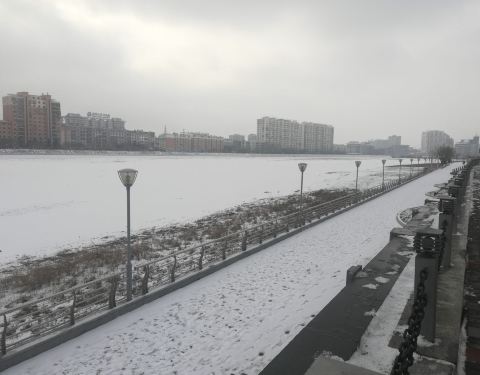 布尔哈通河横穿延吉市,把城市分为南北两个部分,南北两个城市区之间是通过大桥连接的,所以市区内有很多大桥。站在延吉大桥上拍摄的布尔哈通河,冬季河水基本断流了。