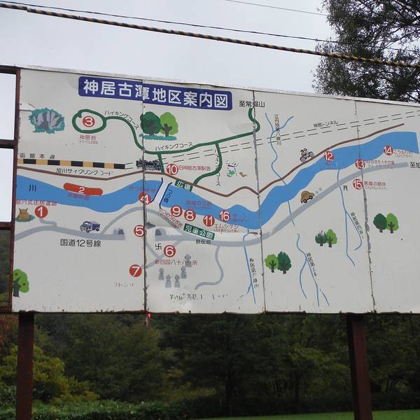 在爱奴语中意为魔神寄宿之地。被选为旭川八景,在石狩川急流上架设的吊桥及峡谷所创造出的景观、让四季呈现出神秘的美感。 以红叶名所而闻名,秋天的景色更是鲜明艳丽。树木、河川和桥梁描绘出巧妙出色的对比。是许多爱奴传说的遗留场所、并有奇形岩石和坑洞分布。还可以看到坑住居遗迹和巨石群等、非常不错。