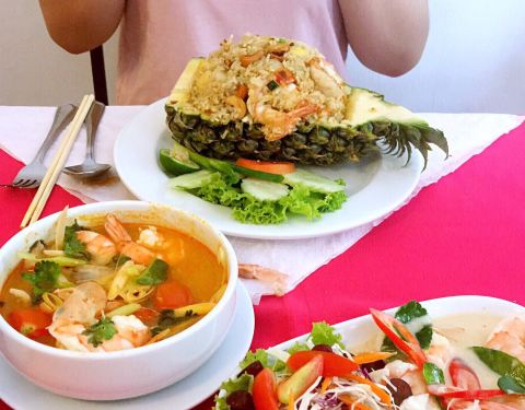 环境简单朴实,口味又很正宗的泰式餐厅。主要是提供当地的特色美食。这家的菠萝饭香气溢人,酸甜适中,口味正宗。这家餐厅真的很有爱,氛围就是那种感觉,性价比也很高,人均70就可以吃的很饱了~很多人推荐的黑胡椒大虾和冬阴功味道也非常好~