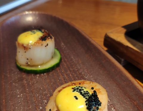 【地址】就在sm二期五楼。 【环境】简约中又带有类似山水画的设计风格,而且空间挺大,有好多隔断区,2人桌,4人桌居多,但也适合小型聚会。 【生鲜炭烧和牛】强力推荐。特别惊艳,牛肉片特别薄,半生的状态,有搭配好的酱汁,入口没有特别顺滑。 【烤鳗鱼】必点,超好吃,鳗鱼特别厚,烤得超好吃。 【红酒鹅肝】我点的这款是冰镇的,挺厚的,但一个人吃,也不会腻哦!如果害怕的,可以吃煎的。 【日本贝柱】挺新鲜的,搭配着黄瓜一起吃。 【刺身】可以直接点自己喜欢的,个人最爱三文鱼,海胆,章鱼,红螺,生蚝还有甜虾。食材都很新鲜,第一次建议不要点太多,不够后面还可以加。 【松叶蟹腿】搭配了醋汁,沾着吃,挺不错的,中和了海鲜的腥味。 【松茸土瓶蒸】店内推荐的,还不错,汤头挺不错的,内有花蛤,虾和瘦肉。 【花胶干贝汤】现在没有上汤海参,换这个,也挺不错的,花胶炖得挺烂的,美容养颜,喜欢。 【黑虎虾】是烤的,虾挺大只,但个人还是比较喜欢刺身里的甜虾。 【炭烤秋田玉米】是挺小巧的玉米,挺不错的,但建议搭配下蘸酱,要不没啥味道。 【香芒鲔鱼】这个挺好吃的,推荐,外皮是圆筒,里面有芒果和鲔鱼,挺清爽的。 【烤榴莲】喜欢榴莲的我,必点啊,超好吃,榴莲味超足。 【甜品】都挺不错的,杨枝甘露,提拉米苏和焦糖布丁,都好吃。 【饮品】我喝了榴莲奶昔和百香果汁,喜欢榴莲的可以选择奶昔,好喝,浓郁。