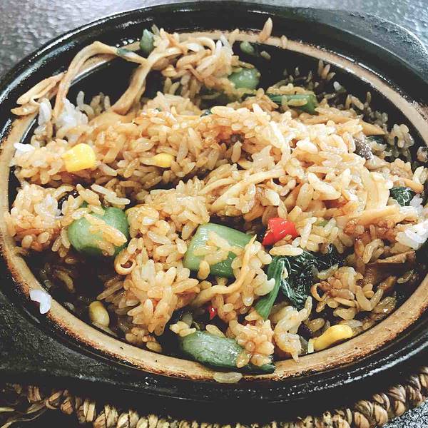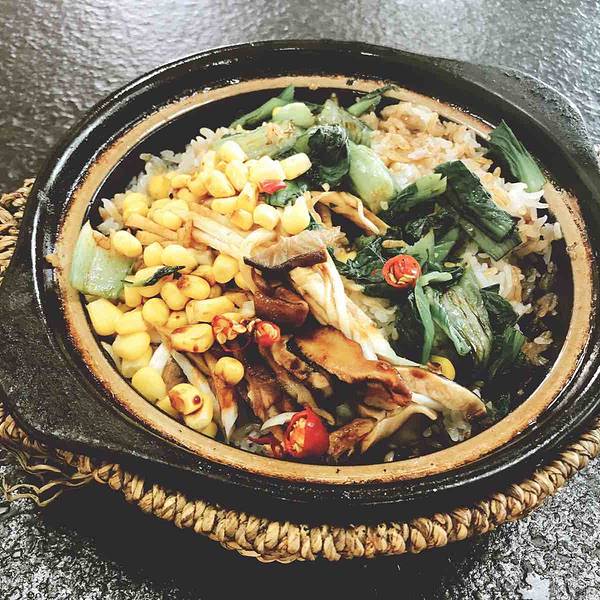 家门口的一家小店,每次路过都看到里面坐满了用餐的人,不太喜欢吃煲仔饭,所以一直也都没有尝试过。他们家的招牌很大很醒目,很难忽略。周末路过,看到店里人不是特别多,就进来了,他们家的招牌主要是煲仔饭和砂锅,感觉价格偏贵,煲仔饭15元起,砂锅10元起,汤类的也要5元起。店内空间还是蛮大的,桌子也摆的松一些,没有紧促感。旁边是安装玻璃窗的厨房,厨师一举一动尽收眼底。虽然店内用餐的人不是很多,感觉上餐速度还是比较慢的,煲仔饭制作本来也会费时一些。等了大约十几分钟上桌。分量还挺大的,一个女生的量足够了。店了份田园的,上面铺满了蔬菜,酱料上桌后电源才会倒入,店员会直接当面将饭拌均匀。下面有薄薄的一层锅巴,脆脆的很好吃,饭粒也很入味,第一吃感觉还不错。