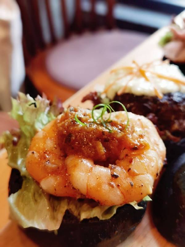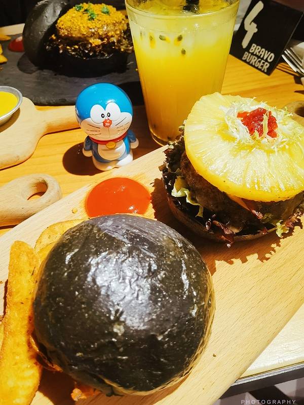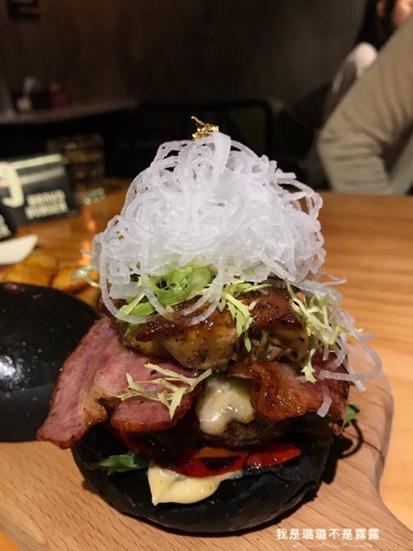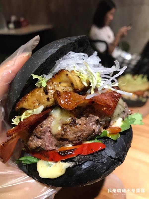 很多年前住过沙坡尾大学路,这家百万万汉堡就开在当年老地方旁边,就在现在沙坡尾游客中心创意港的小巷里,黑色的工业风,粗犷但是不缺情调,店里生意很好,楼上楼下都坐满人,下单在位子服务员端菜,先给上了柠檬水,服务很不错。 鹅肝汉堡:店里的招牌菜,黑色的墨鱼汁汉堡皮,这个香软微甜有嚼劲,有一个在外面,要吃合上就行,里面有厚切香嫩的牛排,喷香的培根,重点是肥美浓郁的鹅肝,几重口感融合实在让人食指大动,蛮大的一个很快就吃光,薯条也挺香的,上面还有金萡。 百香果莫吉托:这是服务员推荐配鹅肝汉堡,酸酸甜甜果然很解腻,一口汉堡一口冰爽的饮料真是绝配。 回到沙波尾的老巷子,坐在当年来来回回的老地方,吃着大受欢迎美味的汉堡,这样的怀旧,真的不一样