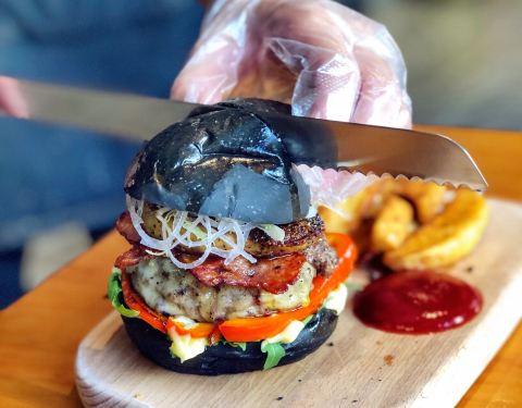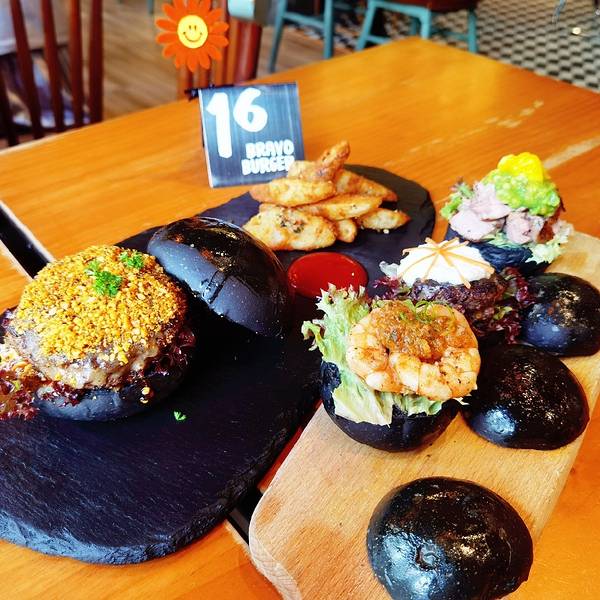 位于沙波尾附近的百万万汉堡店,特色的黑汉堡,用料十足,饮品选择也丰富。位置稍显隐蔽,店外墙壁上的涂鸦、简单的小摆设、手绘的菜单,处处可见这家小店的用心。就是这么一家迷你型的小店,却吸引了无数人宁愿大排长队也要品尝这汉堡的美味。招牌的夏威夷牛肉汉堡,特色的黑面包,加了片菠萝在最上面,色彩赏心悦目,和牛肉饼、生菜加之酱料融合一体,一口咬下去,满口生汁,欲罢不能。