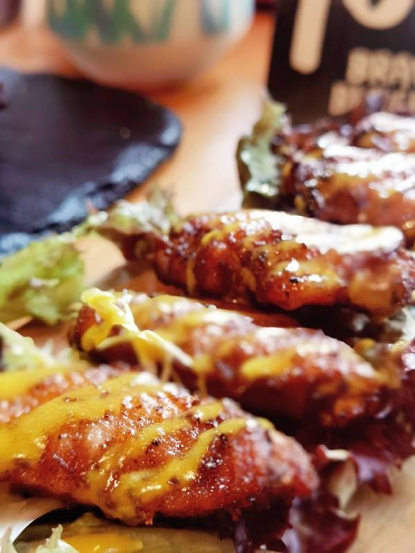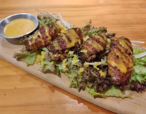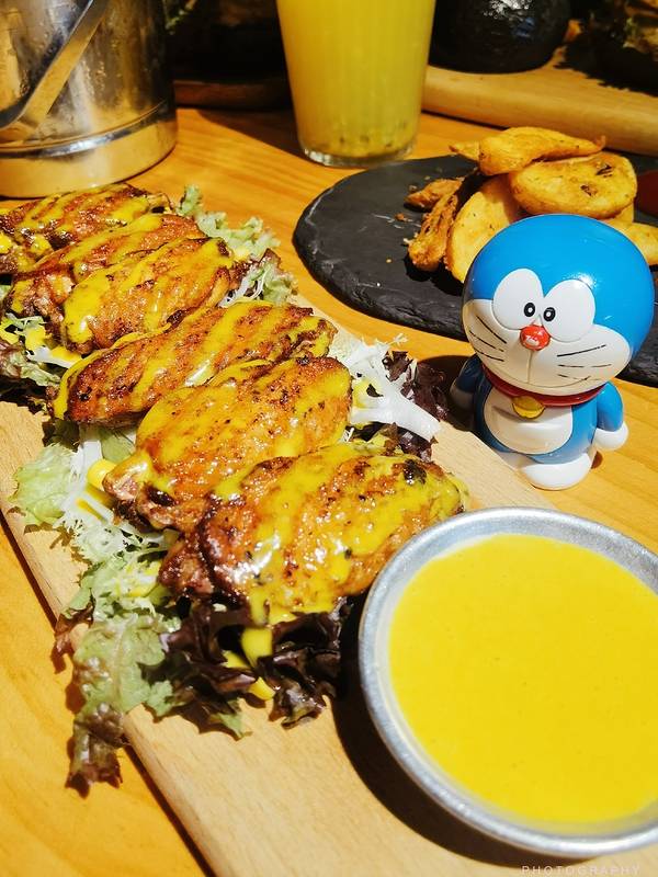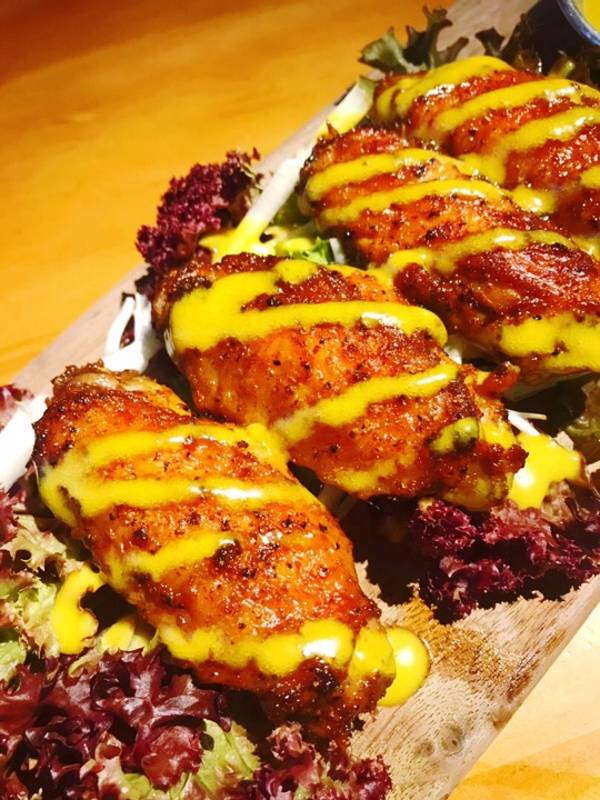 看起来太诱人了,烤得焦黄的鸡翅中,吃起来鸡肉还是很嫩的,搭配柠檬芥末酱汁更美味。