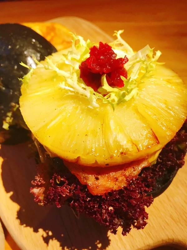 喜欢吃菠萝🍍,烤菠萝片,培根🥓,牛肉片太厚实了,黑色面包,我是分层吃的,一口牛肉一口菠萝吃起来口味刚好综合一个不会腻,一个就已经很满足了,大口吃肉的感觉。