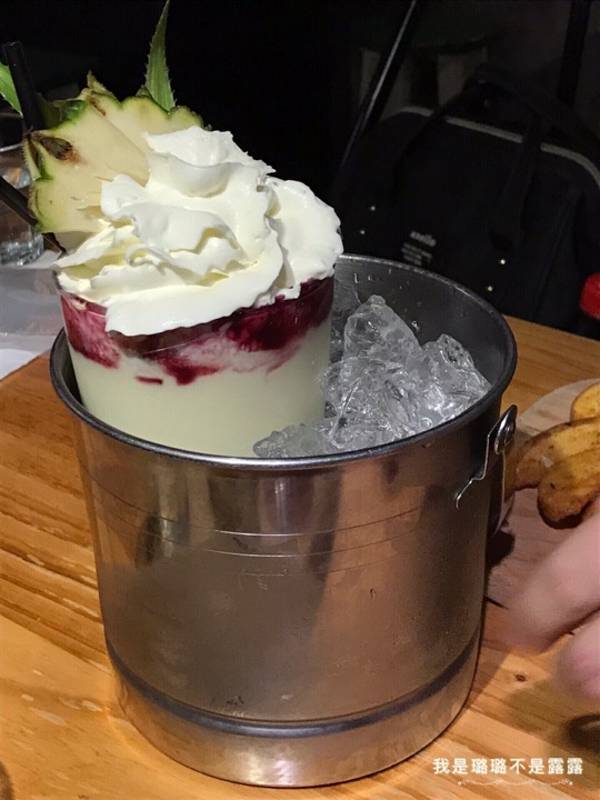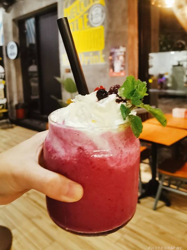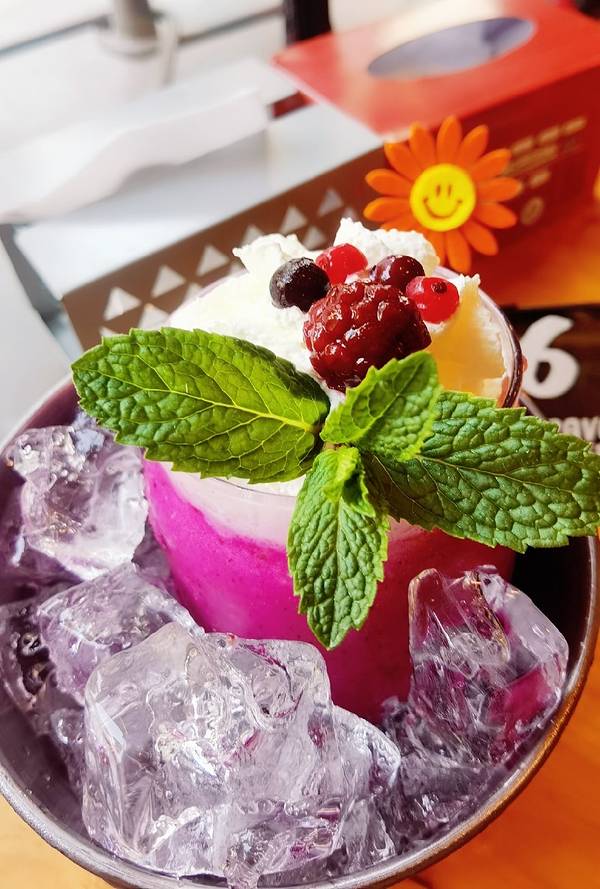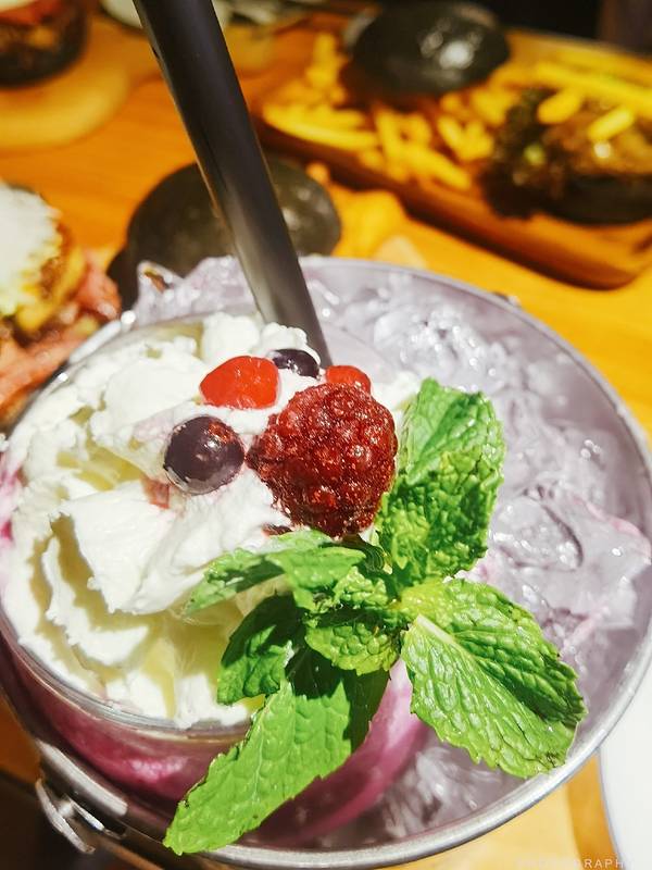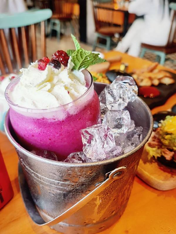 用冰桶装着的奶昔看起来就很霸气,上面是奶油,底下蓝莓奶昔,还有树莓果肉,喝起来很冰爽。