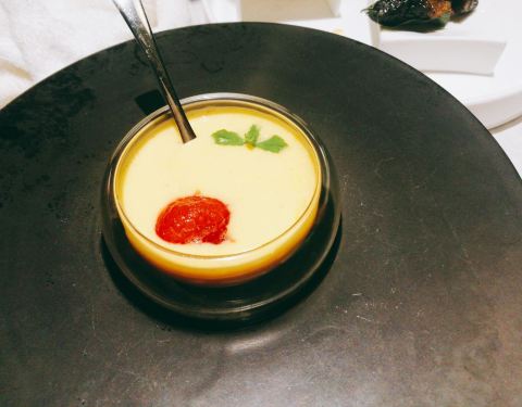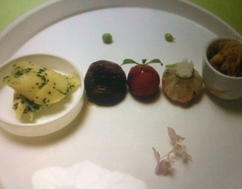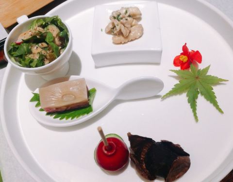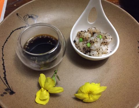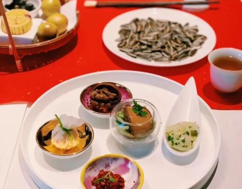 山房坐山伴水,进门前一阵凉风吹散了一身的喧嚣和尘俗,微暗的灯光,店员青色的布袍,想不到南京还有这样的地方。 吃完饭出来,凉风习习,星光闪烁。 一开始,店员就铺上了两层宣纸作垫衬,估计是有什么讲究。 冷菜拼有绿色沙拉,黑蒜,水晶肴肉,中间像红樱桃的吃起来好像是山药?有点怀石料理的感觉,是细致的,当季的。