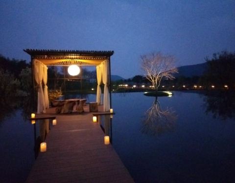 南京青龙山庄酒店·龙吟山房在市区不远处,选地清静,依山傍水,周围环境仿如画卷。还未进门,映入眼帘的便是平静的湖面和零星石块铺成的小道,如此风景更是为餐厅增加了一抹幽静。房间以24节气命名,真正的只为与大自然融合而生。