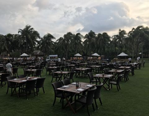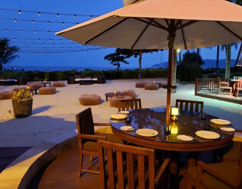 非常好的一次晚餐体验。用餐地点在海滩边,傍晚微凉的海风吹着非常舒服。我们选择了沙滩位,吃饭的时候光脚踩在沙滩上感觉很特别。另外服务没得说,服务员态度友善很贴心也很勤快,环境美美美,有乐队很好听,夜晚灯光也很美,最后食物完美,种类非常多,烤肉类,主食,甜点,海鲜都味道不错,水果也很高品质,扇贝刺身是印象最深的,超级新鲜黄特别大,自然的甜甜的,超级好吃。