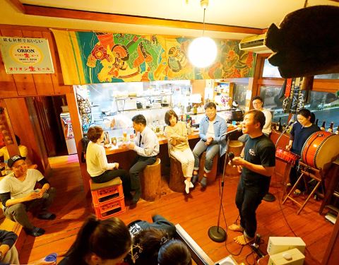 三線の演奏と島唄♪…店主さんは料理人ではなく演奏家の経営者です。