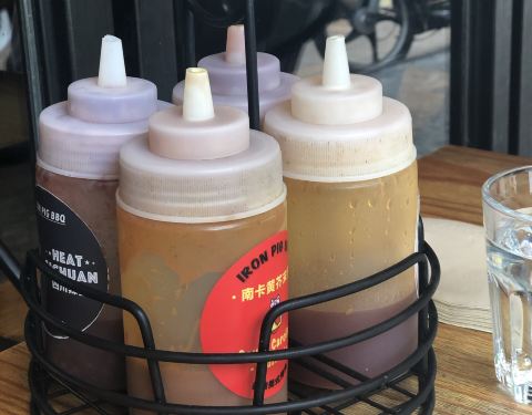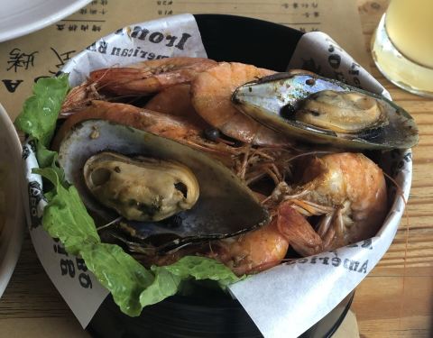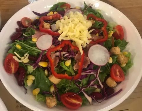 第一次吃美食烤肉,虽然每一份份量不大,但是肉菜还是很扎实。蔬菜沙拉不错,搭配三种肉食拼盘会解腻。炸鸡肉和鸡翅蘸酱都是德克萨斯辣酱,海鲜桶很有黑胡椒味道。芝士薯条有蔬菜有肉也有酱搭配很不错。