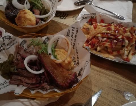 🌿环境🌿 美式餐吧的调调,稍微拥挤和嘈杂一些,不过非常热闹,看到有不少的老外食客。 🌿服务🌿 提前订餐订位很顺利,幸好小姐姐帮我们安排座位预留到了六点🕕,当天遇到大雨,到的时间刚刚好。😅餐厅服务也算是到位,毕竟客人真的很多。看到还有不少等位的朋友。 🍟奶酪烤肉薯条🍟 这是薯条🍟+烤肉🍖+奶酪🧀的神仙组合!这个神仙组合的口味很赞,当然也是热量爆炸💥!但是真的滋味特别浓郁,薯条🍟本来就是很讨喜的炸物了,再加上拉丝的奶酪🧀和醇厚的烤肉🍖,反正我是忍不住的。😆😆😆 🍖烤肉双拼🍖 这款有四种肉可以选,我们要了牛排🥩和鸡肉🐔。牛排是码了很多料的那种,如果非要跟传统西餐厅比较肯定不合适。😆😆 这里的烤肉有很多种不同的酱汁选择,典型的美式吃法和美式快餐味型。不同的酱料可以给肉肉带来不同的滋味,还是可以试试滴。而且这里还有川式辣酱,也是“入乡随俗”了。 🥗谷物鸡肉沙拉🥗 我觉得要是我在减肥期间,每天点铁猪的这款沙拉,我只有越来越肥的。😂😂为什么?份量太大,内容太风度,完全达不到降低热量摄入的目标。哈哈哈哈😄😄😄不过,日常吃吃,很可以!
