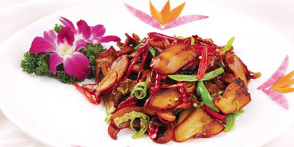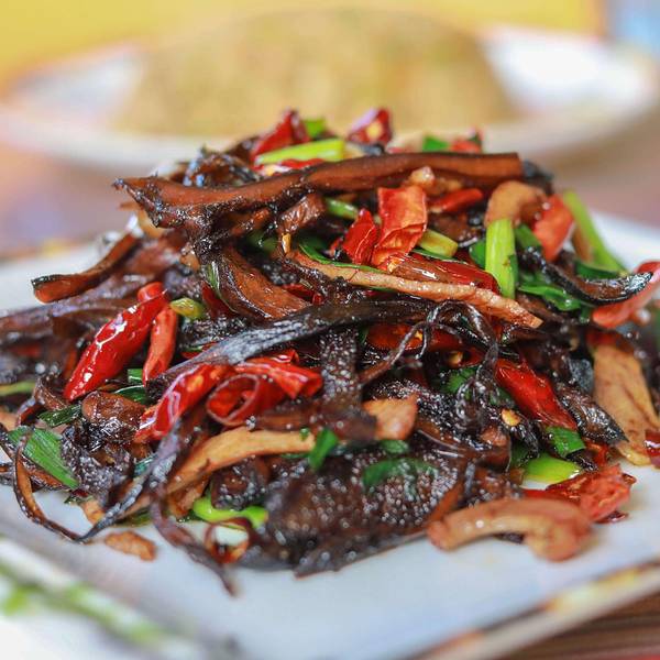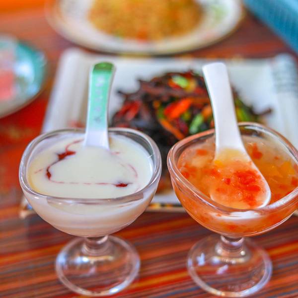 菌子做法很多,熬汤吃菌锅以外还可以炒菜,香爆虎掌菌,爆香的味道,让菌子吃起来特别的香,里面还有肉丝、辣椒,特别下饭的一道菜。特色甜品
