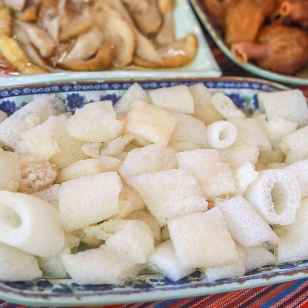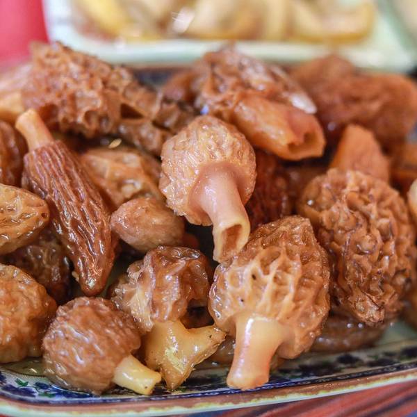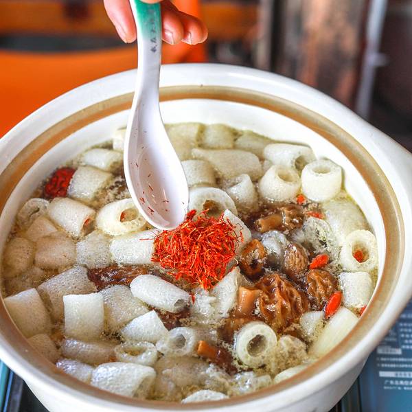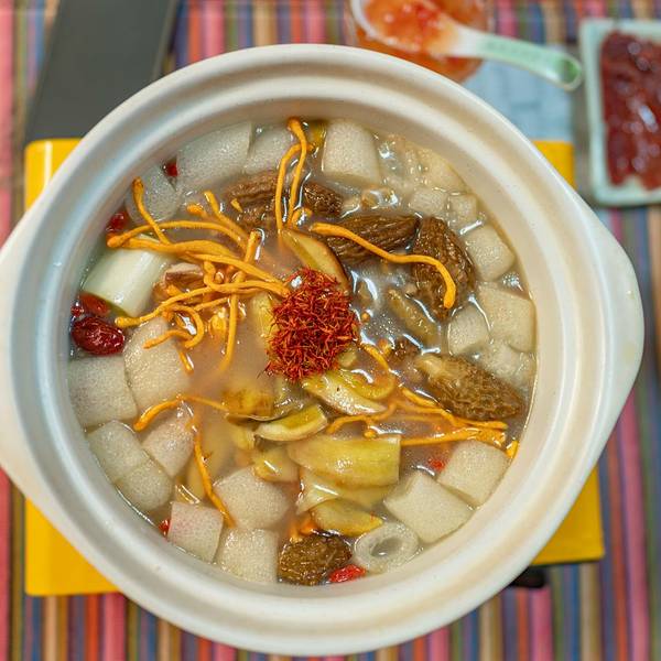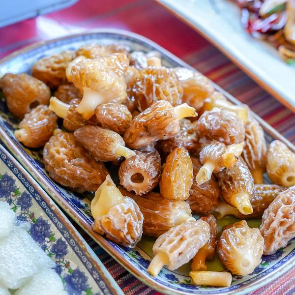 熬制的,十余种菌子可以自选(牛肝菌、红乳牛肝菌、喇叭菌、青头菌、虫草花、雪山冷菌、老人头等),我选了牛肝菌、竹荪菌、羊肚菌,或者点一份野生菌拼盘,搭配有牛肝菌、竹荪菌、黄罗伞、红乳牛肝菌、山药,有小锅和大锅两种,我这满满一大锅可以够2-4个人食用,如果人不多,点1-2种菌子就可以,和涮火锅一样,涮肉前一定要先喝完汤,加了滇红花的汤,营养更升级,味道也是一个字“鲜”!野生菌炒菜:香爆虎掌菌