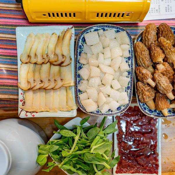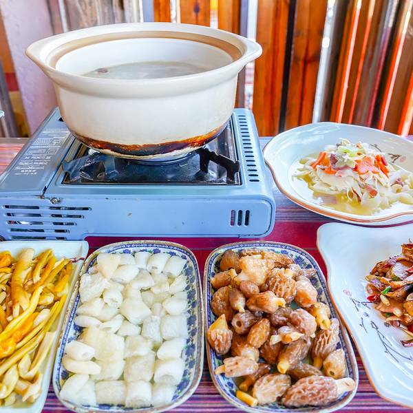 云南 的菌菇非常的讲究,光是菌子就有几十种,之前比较熟知的松茸、竹荪、牛肝菌、羊肚菌、鸡枞菌这些,除此之外在这里还能吃到肉质肥厚的黄牛肝菌、桃花菌、黑松露、鳞肉的虎掌菌、以及青头菌、黄罗伞,菌汤的营养价值非常的高,我点了一份一份跑山鸡锅,给自己舟车劳顿的旅途补充下能量。十余种野生菌可以选择