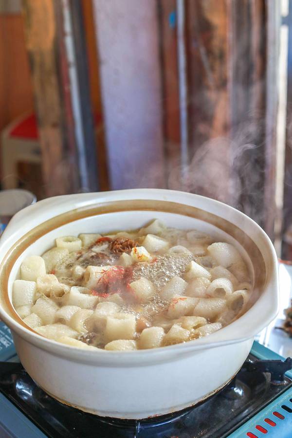 这锅菌汤是用当地的鸡加上猪骨熬制的,营养丰富,同时加入了当地特色的各种菌菇,