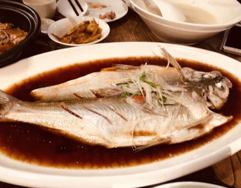 一行五人在大厅用餐的,餐厅对面花园里是包厢。 花园太美了!还有鸭子在水里戏嬉,未见鱼儿们惊慌游开吖,很好奇它们如何共处的。 5人点的6-8人套餐,量很大,吃不完打包三盒。 香酥鸭果然是同网友说得,皮不脆、有点儿咸,但是软软的大腿肉肉,不是很肥,很好吃哟! 松鼠鱼的面粉稍厚、造型挺括,很甜,不是酸甜的,只有甜。配料里有玉米粒,没有找到松仁。台湾朋友问:为什么叫"松鼠"鱼呢? 文思豆腐羹、炒鳝糊、唇菜芙蓉、干锅花菜无功无过,整体感觉不错的👍