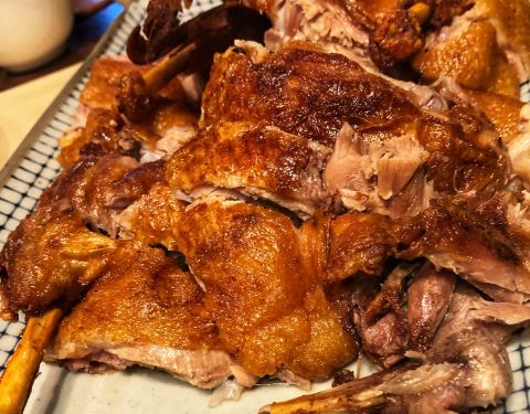 一行五人在大厅用餐的,餐厅对面花园里是包厢。 花园太美了!还有鸭子在水里戏嬉,未见鱼儿们惊慌游开吖,很好奇它们如何共处的。 5人点的6-8人套餐,量很大,吃不完打包三盒。 香酥鸭果然是同网友说得,皮不脆...
